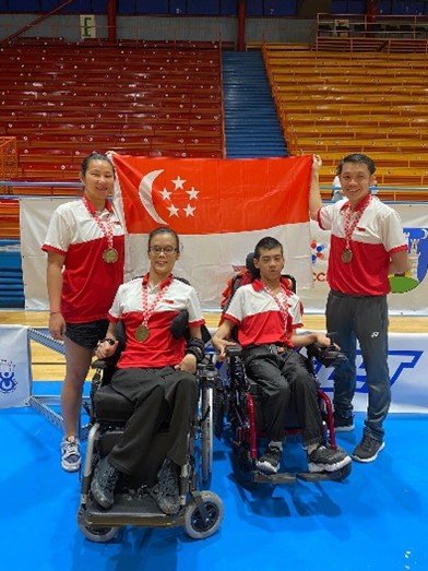 I was classified as a BC3 player, which is open to people with several different types of disability, including cerebral palsy. They are unable to use their hands to throw the balls due to their physical disability, so they need to use a ramp to help them to propel the ball. And they also need a ramp assistant to assist them in the game. During the game, the ramp assistant is facing the athlete, can’t turn to see the court, and just follow the instructions given by the athlete. Every Friday my mother will join me in my CCA to act as my ramp assistant. Just 3 months after I joined this CCA, there was a local competition, so my school sent all the students in that CCA to participate in this local competition. At that time, I didn’t even have my own ramp and balls, so when it was my turn for matches, I just borrowed from other teammates who were not having matches at that time. And of course, I lost in my 2nd pool match. My mum always teased me by saying that I cried so loud in the sports hall when I lost the match and she felt so embarrassed, and quickly pushed me out from the hall to comfort me. And she recalled one of my teacher said:” Very good, he cried, which means he has expectations, he will succeed in future!”