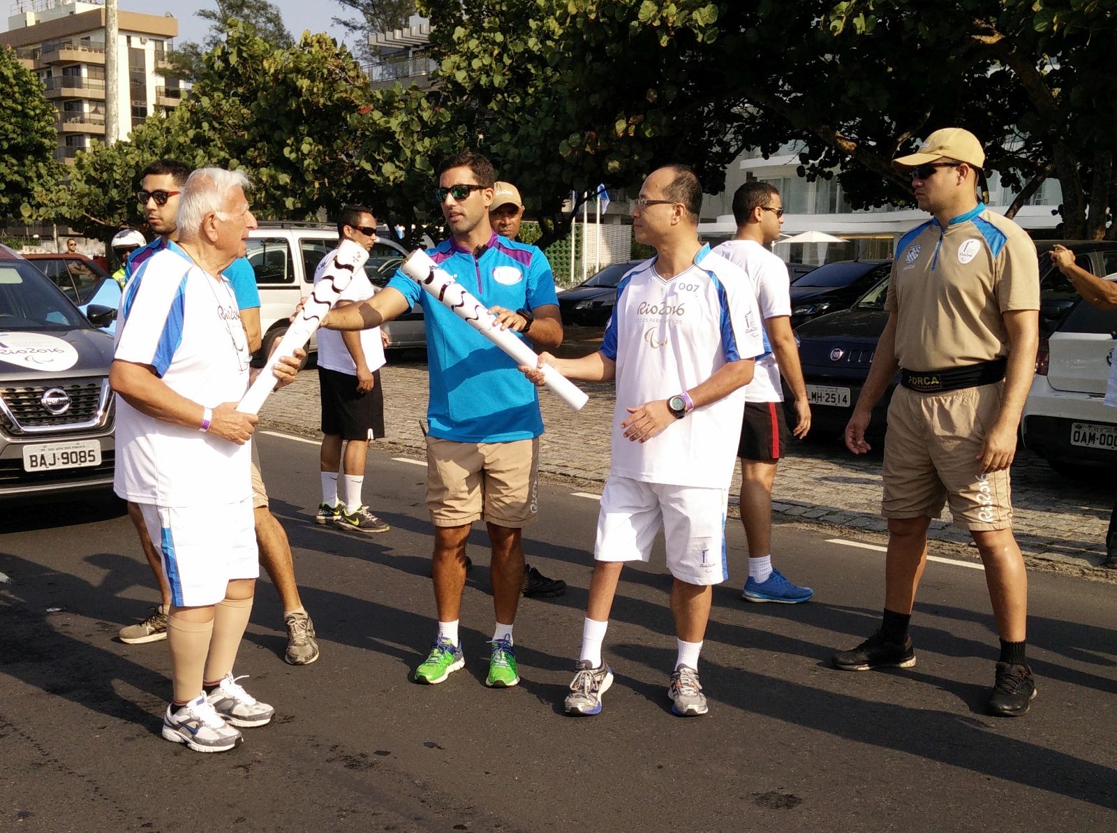 Dr. Bassam Qasrawi (left) lights torch of Nelson Tai (right) in Recreio dos Bandeirantes, Rio de Janeiro