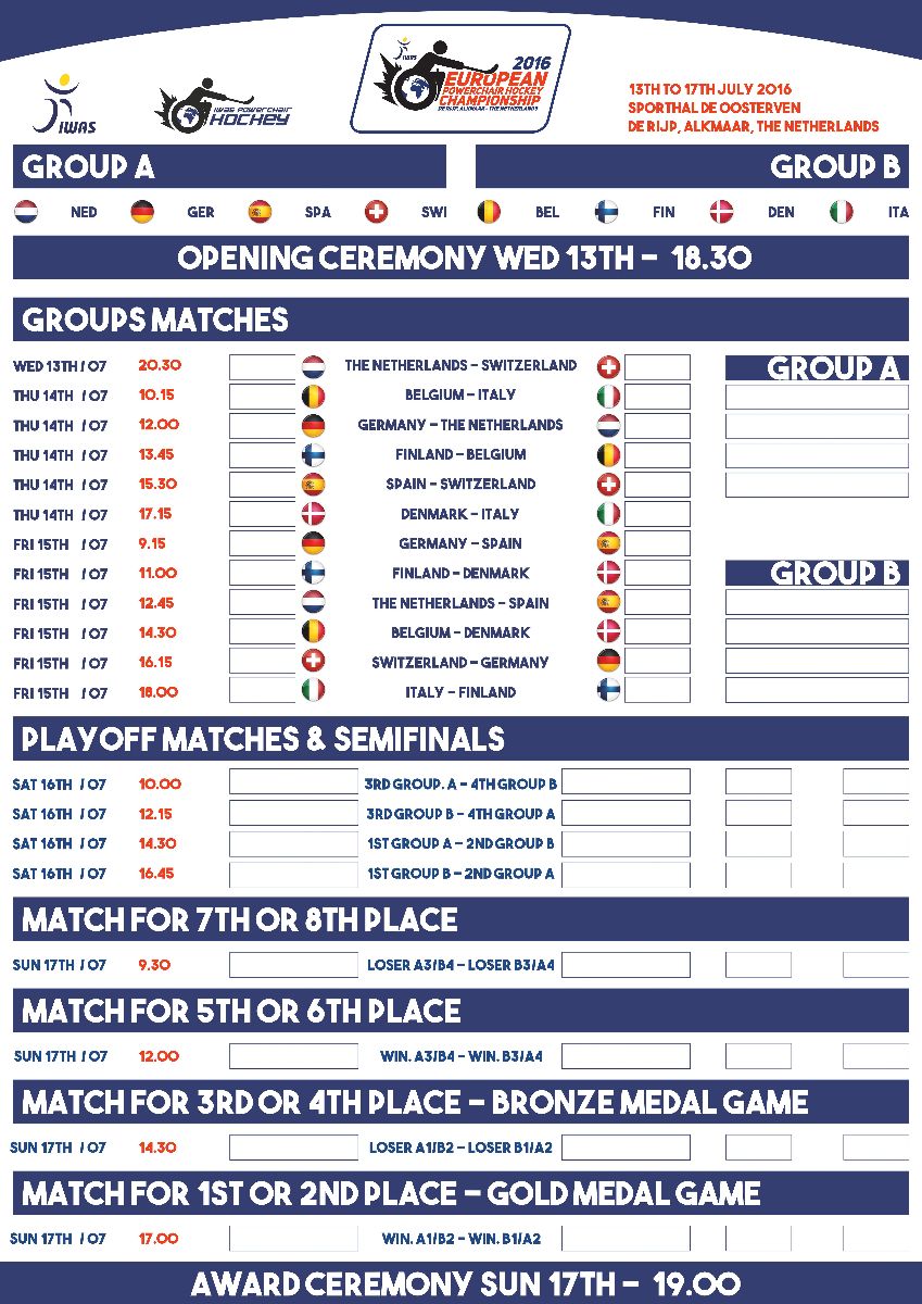 The IWAS Powerchair Hockey European Championships 2016 have officially announced the competition schedule for the the competition due to be held between 11 and 18 July 2016 in the Dutch province of De Rijp, North Holland.